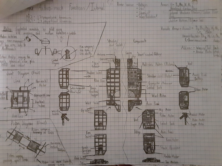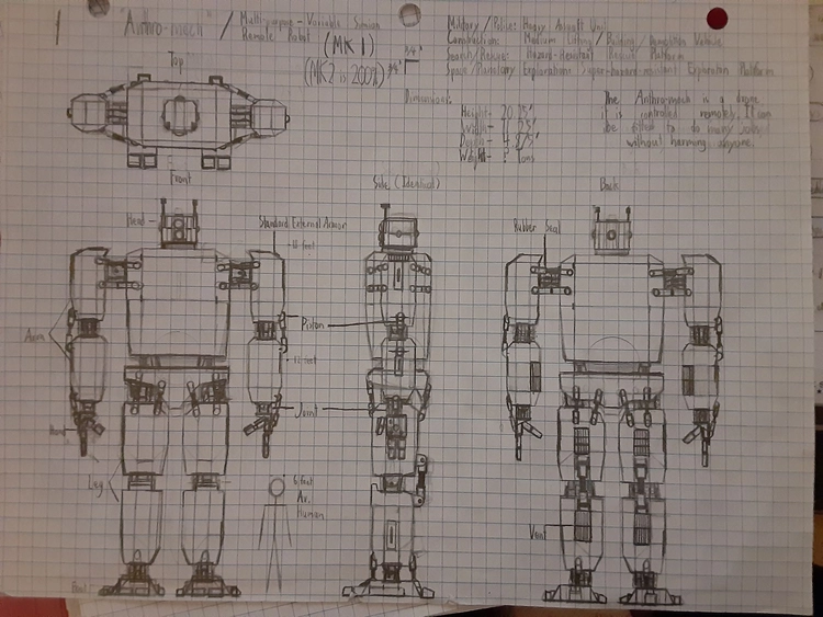 I submitted this portfolio for an articulation at Rio Hondo College, granting me credit toward its ARCH115 “Introduction to Residential Architecture” class. An interesting additional requirement for the portfolio was supplemental sketchwork. So, I included the following sketches of a humanoid drone I drew in 7th grade, being vaguely inspired by the Mantis mech suit from Halo 4 and the Veritech Valkyrie jet-fighter-mech-hybrids from the Robotech anime saga. Additionally, I drew a correctly-scaled comparison of Halo 4’s UNSC Mammoth mobile command center, and the largest real-world analog I know of, the Terex Titan, a giant mining haul truck prototype.